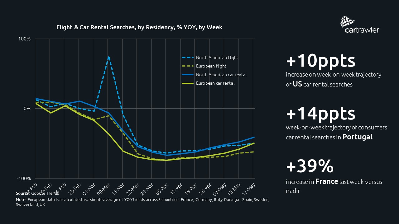 2nd June 2020: Over the last number of months, we have been closely monitoring consumer behaviour and trends in search data across 10 core markets. As travel bans begin to ease, we can already see early signs of recovery. Consumer search trends indicate car rental is recovering at a faster rate than flights, this could be due to the perceived safety of travelling as a unit in a car.